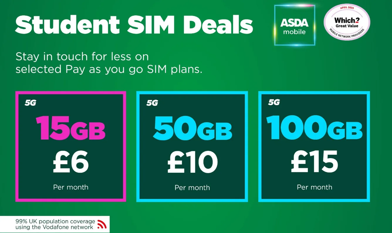 Asda Mobile 15GB for £6/m (monthly contract) - UNiDAYS student discount January 2026